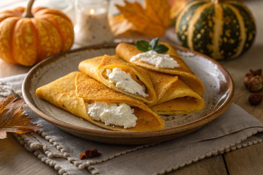 Tekstura sera wiejskiego z charakterystycznymi drobnymi grudkami tworzy interesujący kontrast z gładkim puree dyniowym. Dla uzyskania idealnej harmonii smaków warto wzbogacić naleśniki: