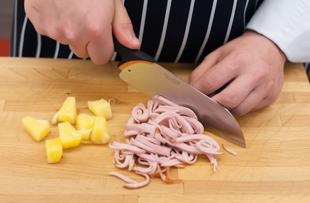 Szynkę potnij w paski. Ananasa odsącz i potnij na mniejsze kawałki.