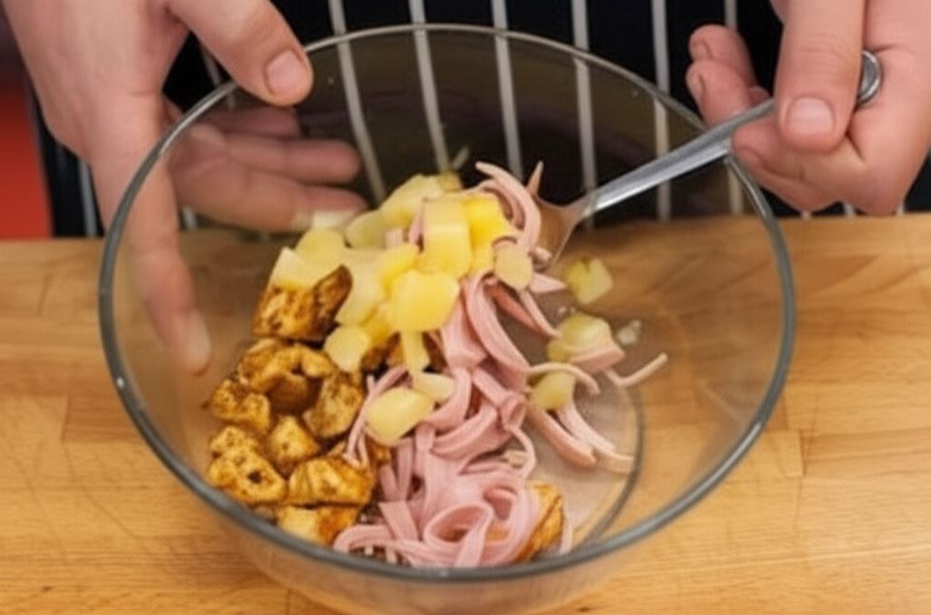 W misce połącz makaron, mięso, szynkę oraz ananasa.