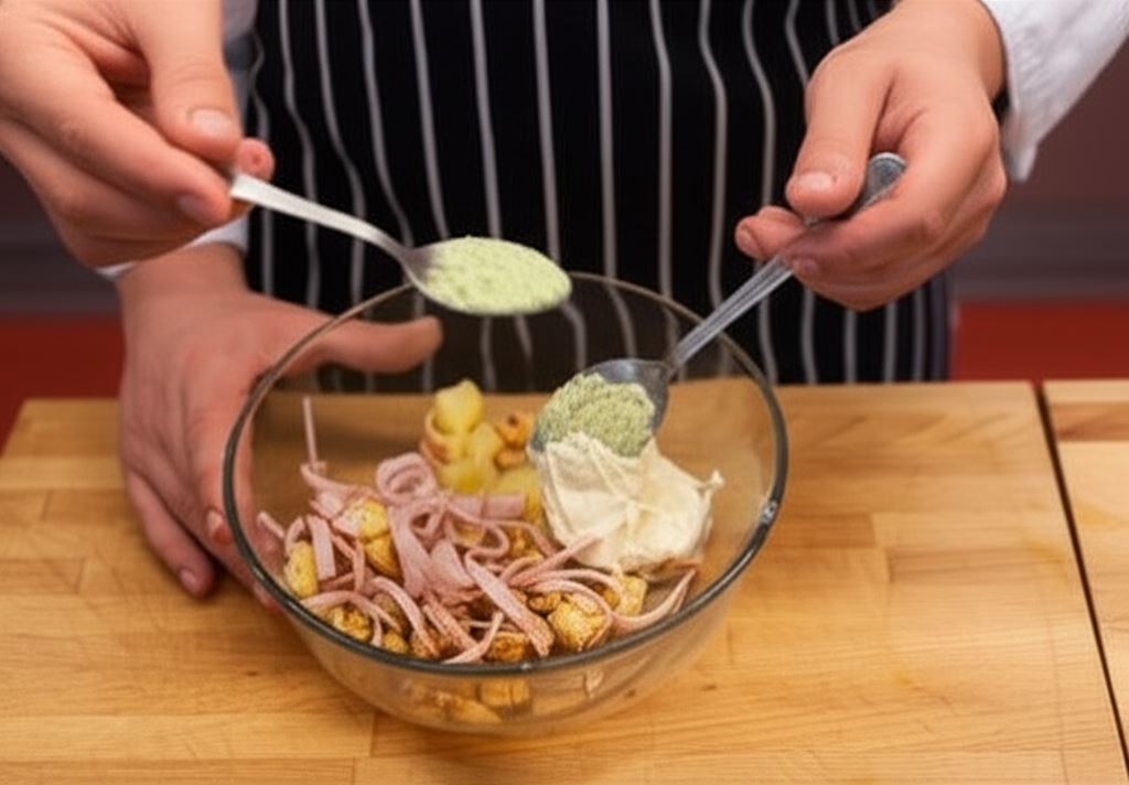 Wymieszaj składniki sałatki i serwuj. Dla wzbogacenia smaku dania, możesz dodać świeżą kolendrę lub bazylię.