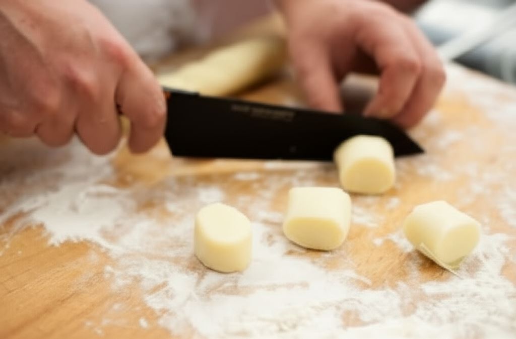 Ziemniaki opłucz i ugotuj w skórce w delikatnie osolonej wodzie do miękkości, około 30 minut. Potem odcedź ziemniaki, obierz i przepuść przez praskę. Do ostygniętych ziemniaków wsyp jajko, obie mąki, szczyptę soli i delikatnie ale energicznie wymieszaj, (nie wyrabiaj ciasta zbyt długo). Przygotowane ciasto przełóż na obsypaną mąką stolnicę i podziel na kilka równych części. Z każdej uformuj wałek i pokrój go nożem na mniejsze kawałki.
