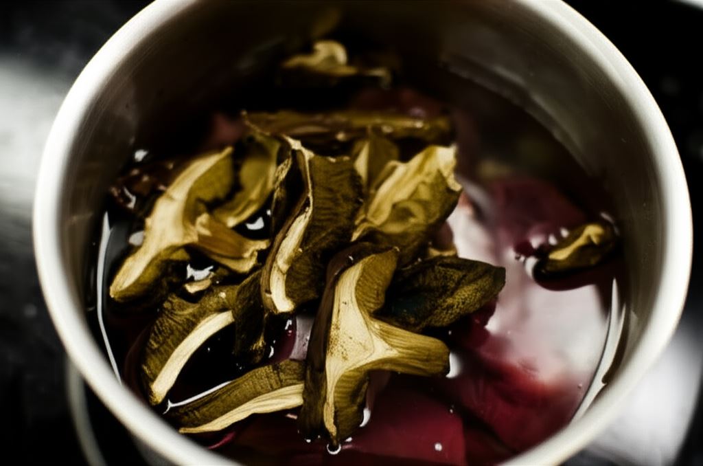 Podziel mięso na parę mniejszych części. Potem ugotuj w delikatnie osolonej wodzie z dodaniem grzybów.