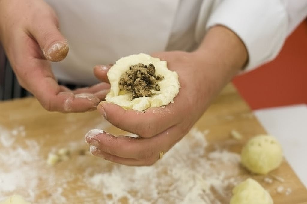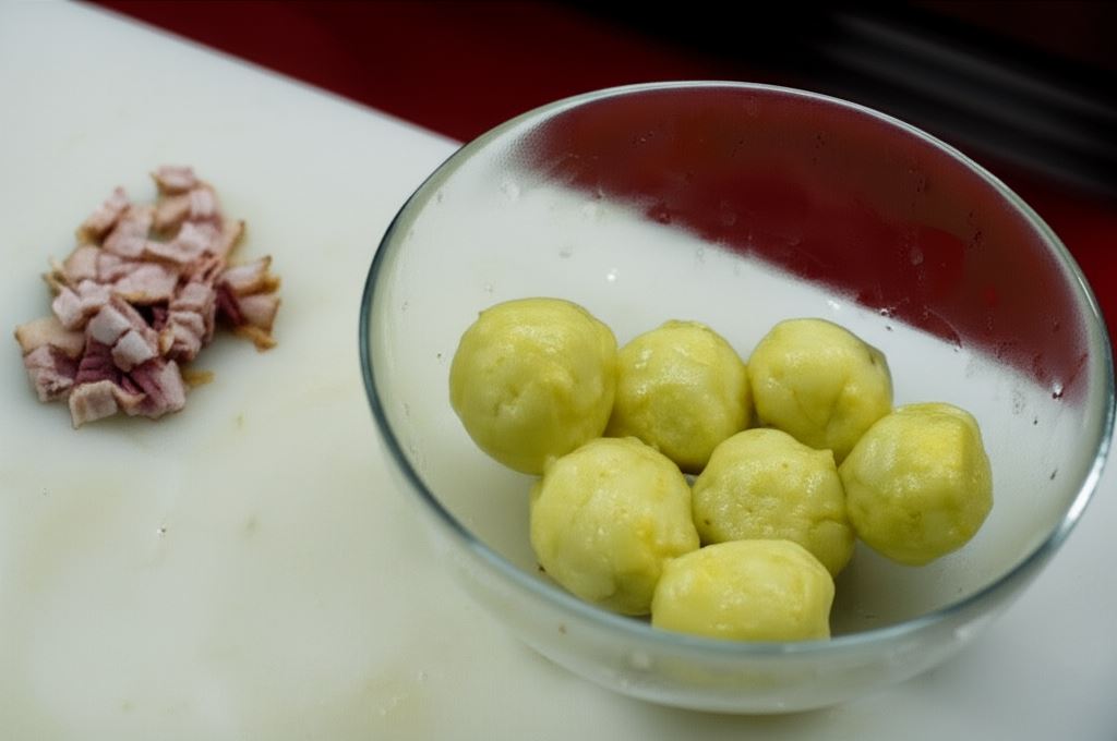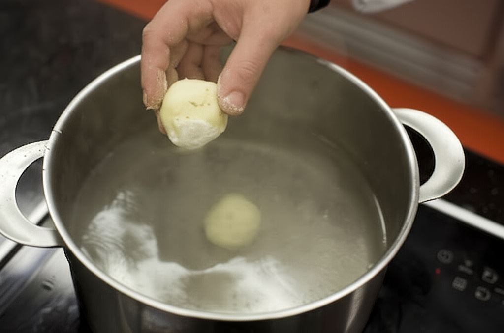 Ponownie uformuj kulkę tak, by ciasto całkowicie otuliło farsz. Przygotowane kulki odstaw na parę minut, aby przeschły. Pyzy gotuj kilka minut w wodzie, dopóki nie wypłyną.