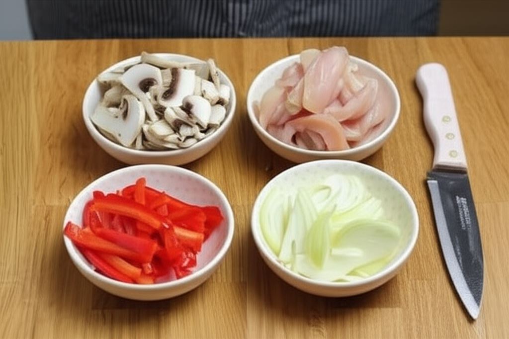 Przygotuj wszystkie warzywa oraz mięso. Cebulę obierz ze skórki, a potem grubo posiekaj. Pieczarki pokrój w plastry. Paprykę opłucz, osusz i tak jak pierś kurczaka potnij na krótkie paski. Świeżą kolendrę opłucz, osusz i drobno posiekaj.