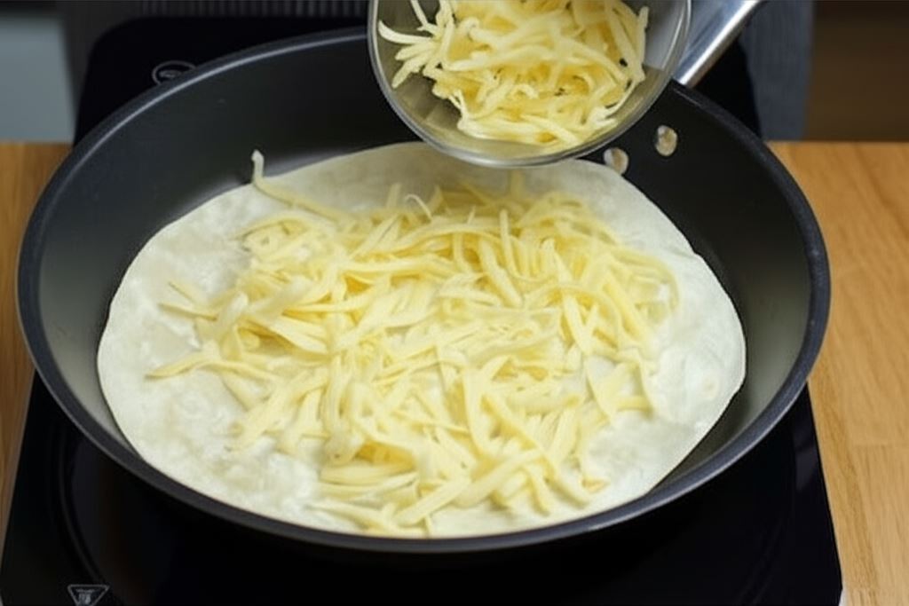 Przygotuj drugą patelnię, której średnica będzie nie mniejsza od tortilli. Placki posyp tartym serem żółtym i smaż je pojedynczo na suchej patelni, aż uzyskają złocisty kolor.