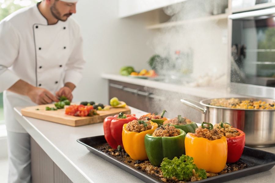 • Wstępne podgrzanie farszu – podgrzanie farszu przed napełnieniem papryki skraca czas gotowania o 30%
