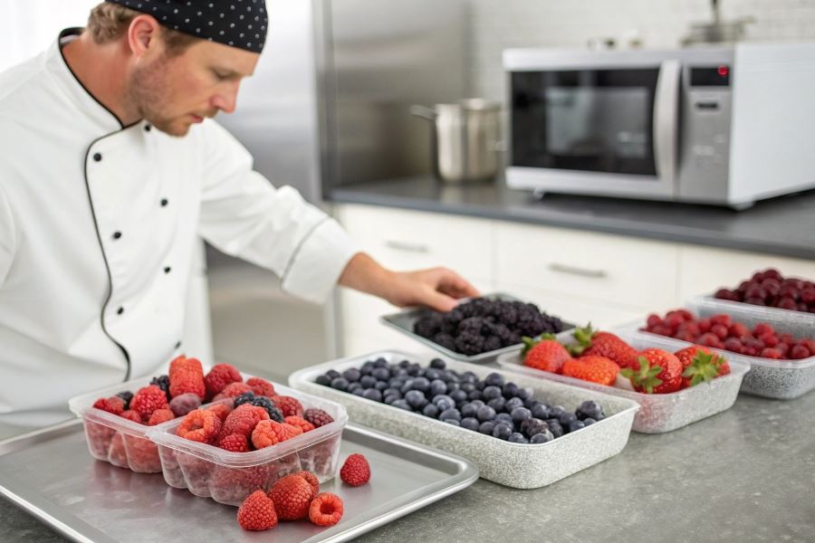 Profesjonaliści kulinarni w 2025 roku coraz częściej stosują technikę kontrolowanego rozmrażania próżniowego, która pozwala zachować do 97% wartości odżywczych i niemal idealną strukturę owoców. Dla domowych zastosowań można osiągnąć podobny efekt, umieszczając szczelnie zapakowane owoce w misce z zimną wodą i lodem.