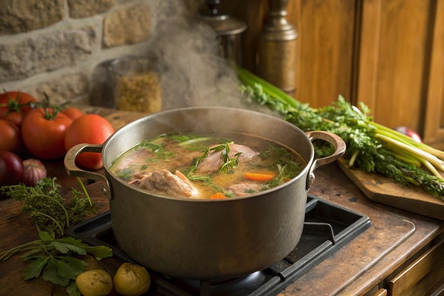 Wywar gotuj na małym ogniu przez około 1,5-2 godziny, aż mięso będzie miękkie i łatwo odchodzić od kości. Pamiętaj, by regularnie zbierać szumowiny z powierzchni – to klucz do uzyskania klarownego wywaru.