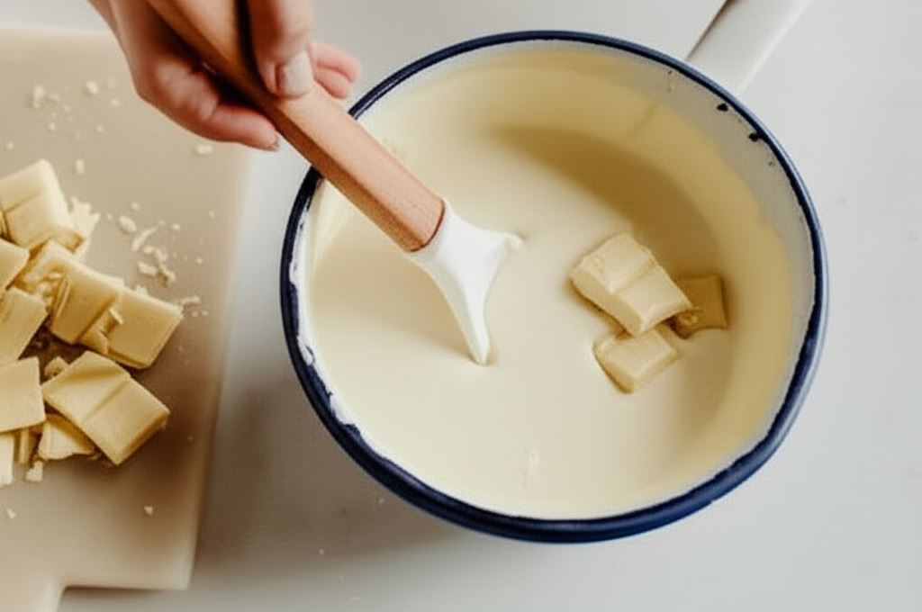 Kremówkę podgrzewamy w rondelku. Wrzucamy do niej czekoladę połamaną w kostki i mieszamy do rozpuszczenia. Po ostygnięciu umieszczamy w lodówce na 1 h.