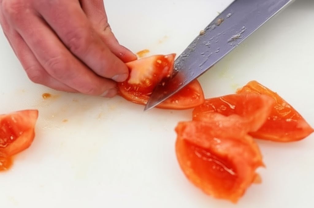 Sparz i obierz pomidora, przekrój na cztery części, wyciągnij gniazdo nasienne. Pomidora posiekaj w drobną kostkę.