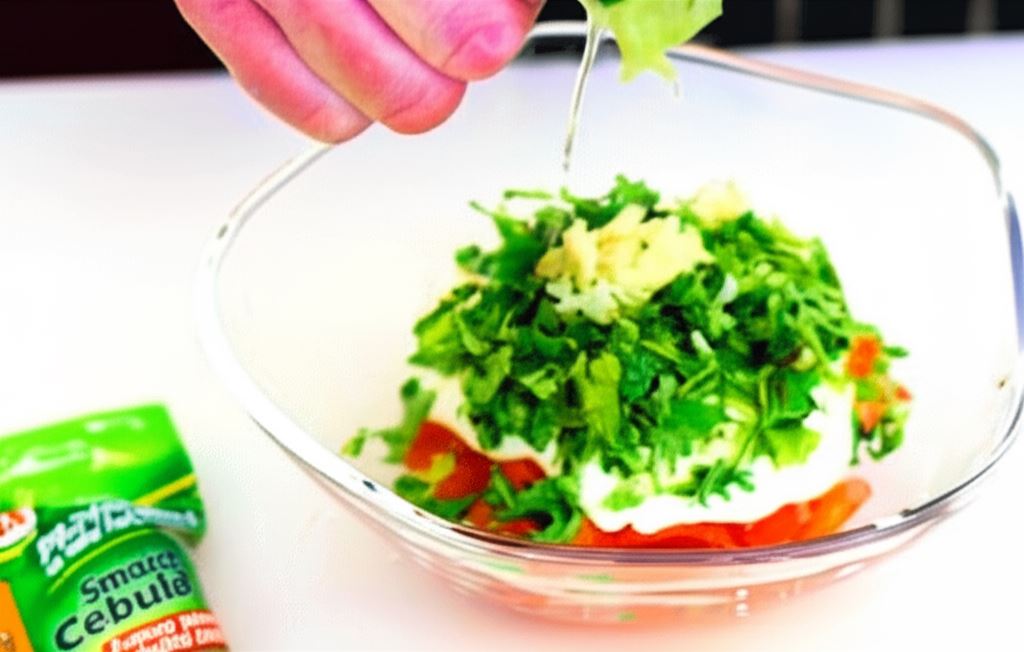 Przenieś do miski, wsyp jogurt naturalny, siekaną natkę kolendry i siekany czosnek. Wszystko przypraw do smaku sokiem z limonki oraz pokruszoną kostką Knorr.