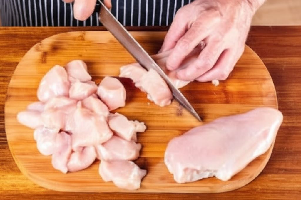 Kurczaka dokładnie opłucz, wysusz i potnij w kostkę o wymiarze 1,5cm