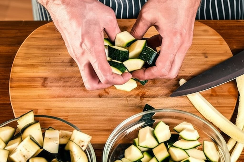 Przekrój cukinie i bakłażana wzdłuż na połowy, a następnie jeszcze raz na pół. Z uzyskanych ćwiartek usuń biały, niesmaczny miąższ. Pozostałą część ze skórką pokrój w kostkę.