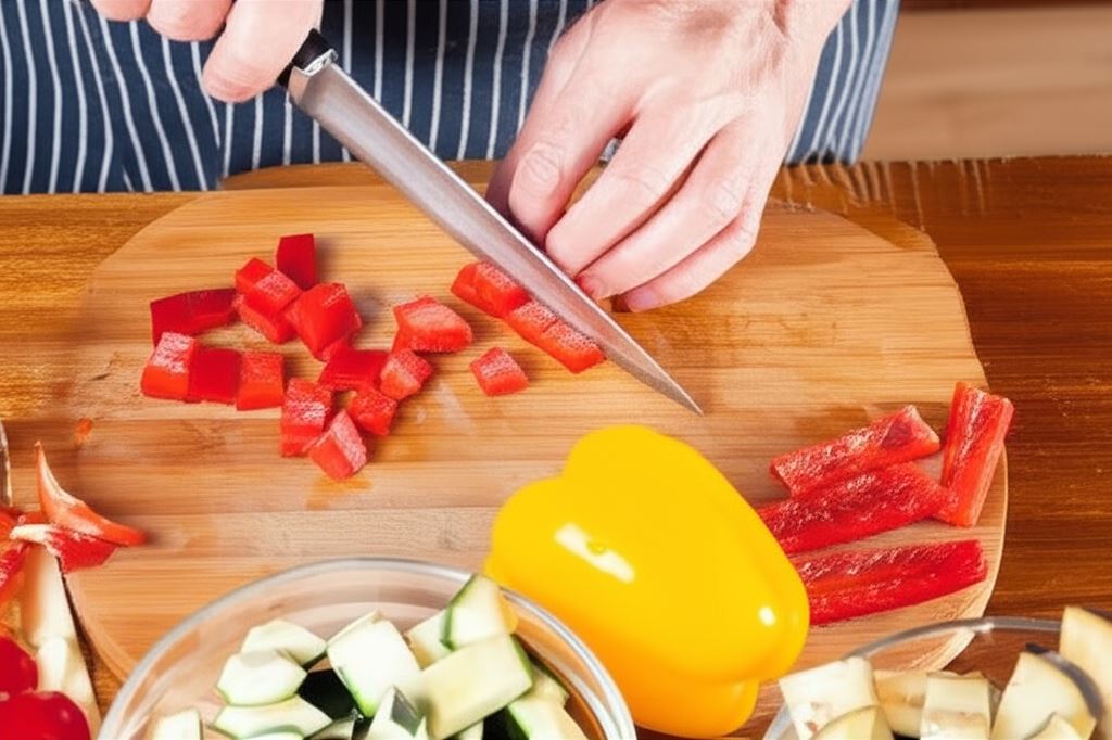 Paprykę oczyść z nasiennych gniazd i pokrój w kostkę, tak samo jak inne składniki. Cebulę i czosnek posiekaj drobno.