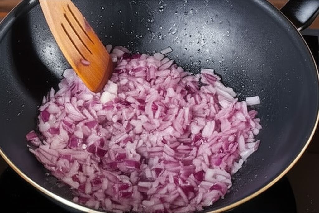 W dużym rondlu lub patelni podgrzej oliwę i podsmaż cebulę oraz czosnek.