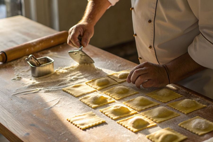 Sekret idealnego ciasta na ravioli tkwi w jakości mąki. Typ 00 zapewnia jedwabistą teksturę i odpowiednią elastyczność, niezbędną przy formowaniu małych kieszonek z farszem.