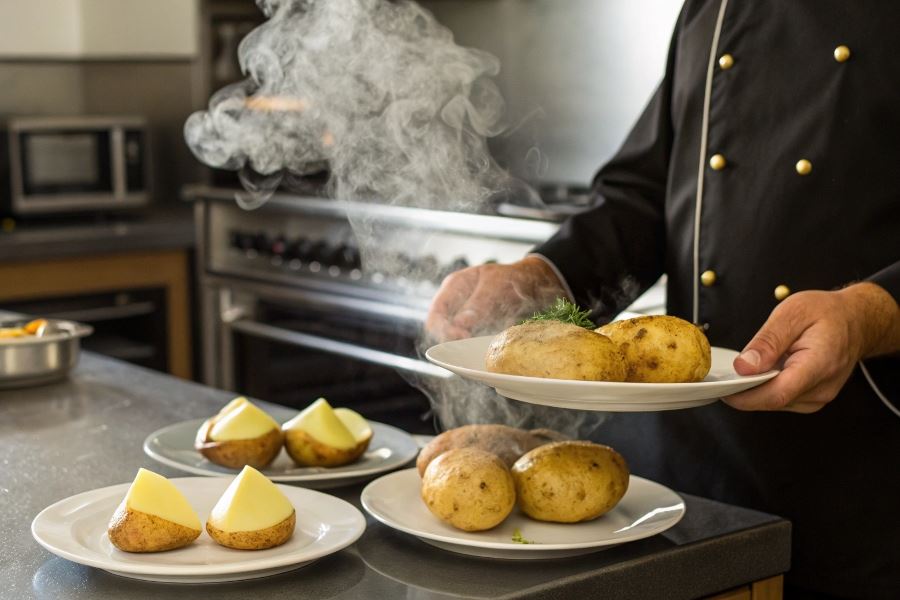 Ta metoda doskonale sprawdza się przy odgrzewaniu całych, pieczonych ziemniaków, zachowując ich puszysty środek i przywracając chrupiącą skórkę.