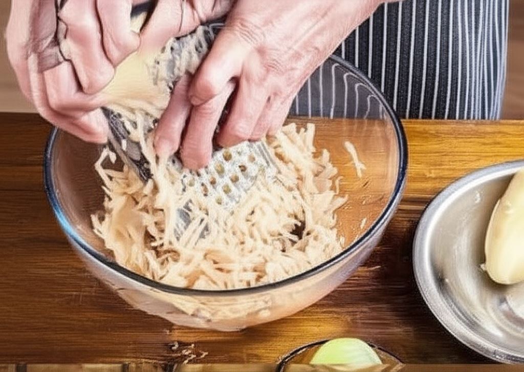 Obierz ziemniaki i zetrzyj je na tarce o grubych oczkach. Odciśnij.