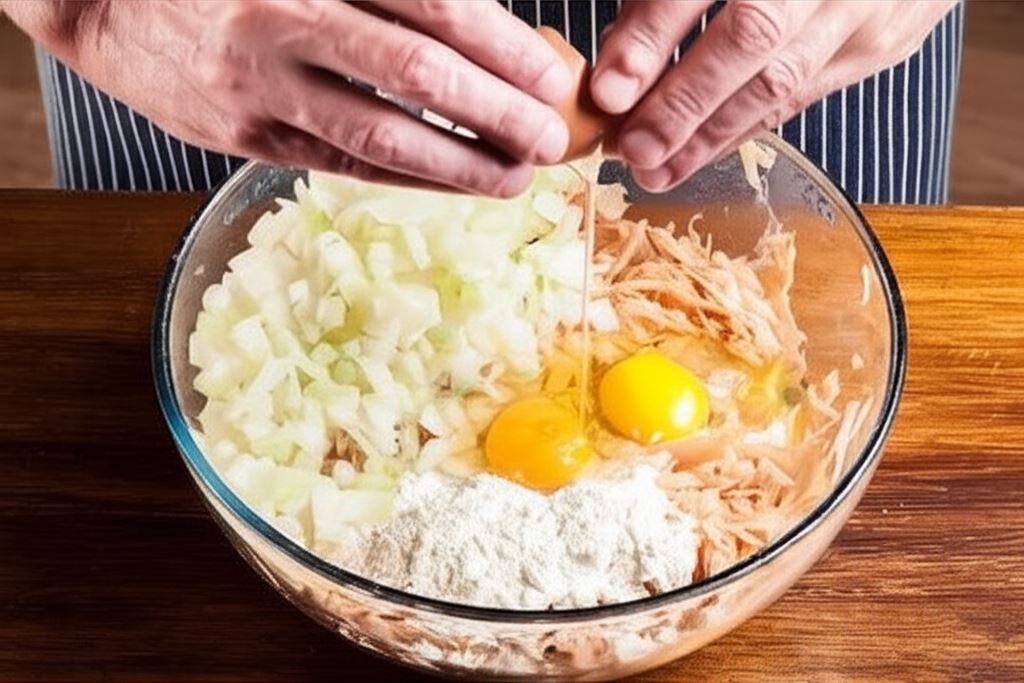 Połącz z nieobrobionymi jajkami, mąką, wsyp posiekaną na malutkie kawałeczki cebulę. Przypraw masę przyprawami.