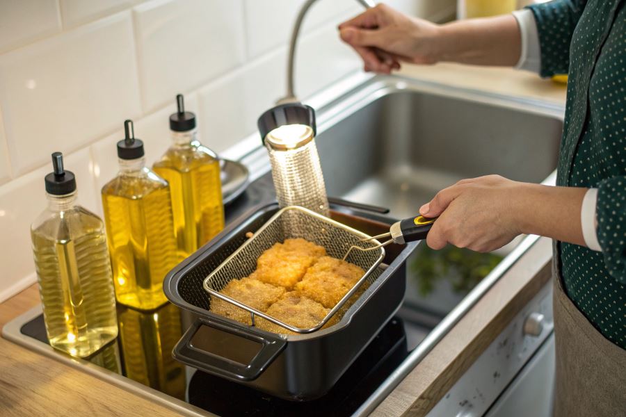 - Produkty bogate w białko (mięso, ryby) skracają żywotność oleju bardziej niż warzywa