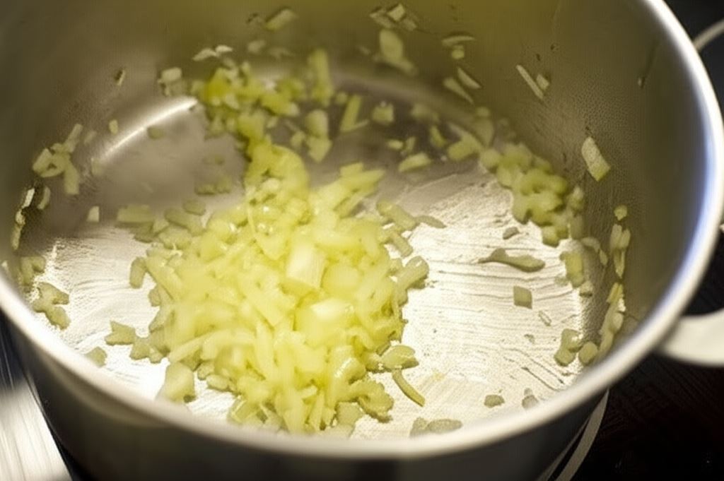 Cebulę i czosnek posiekaj na drobne kawałki. Potem zrumień w rondlu na oliwie z oliwek.