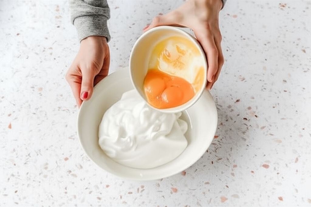 Oddzielamy białka od żółtek. Ubijamy je na sztywną pianę. Podczas końcowej fazy ubijania wsypujemy cukier. Do ubitych białek dodajemy żółtka.