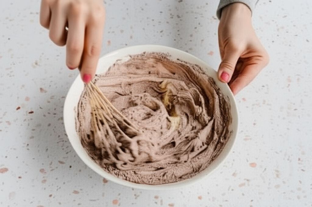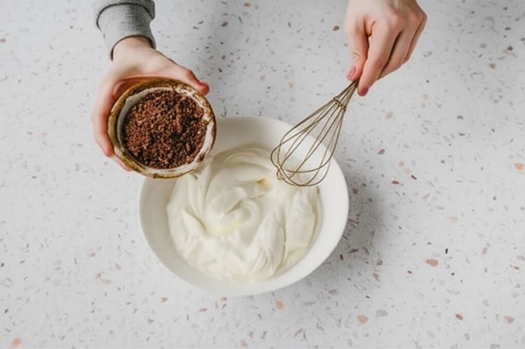 Mąkę przesypujemy do miski. Wsypujemy proszek do pieczenia i kakao. Całość ostrożnie dodajemy do masy z białkami i mieszamy.