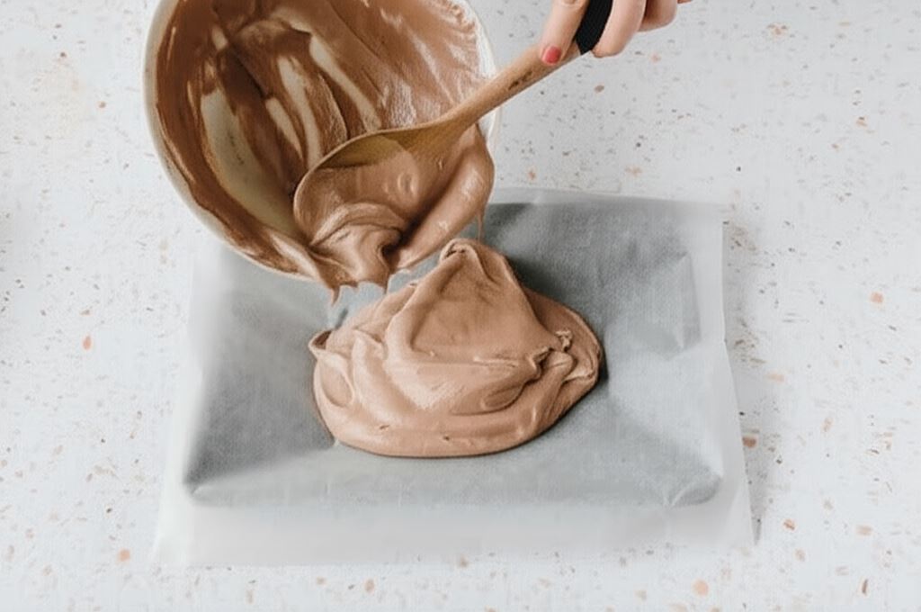 Wylane ciasto przekładamy na blachę wyścieloną papierem do pieczenia. Powinno utworzyć cienką warstwę. Piekarnik rozgrzewamy do 200 C. Pieczemy około 8 min pilnując, by się nie przypaliło. Odstawiamy do ostygnięcia.