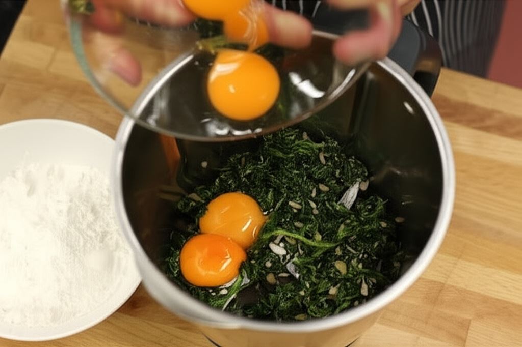 W garnku na rozgrzanym oleju zeszklij czosnek i szalotkę, dodaj szpinak i podsmaż całość przez moment. Przypraw gałką muszkatową oraz Przyprawą pikantną grubo mieloną Knorr. Szpinak odstaw na moment, aby trochę ostygł. Potem połącz go z żółtkami oraz mąką, dokładnie zmiksuj w naczyniu blendera.