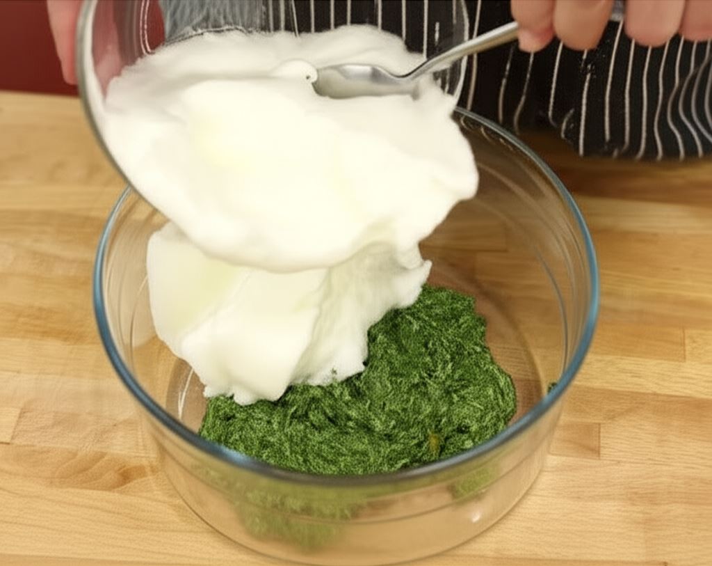 Ubij białka na pianę i wymieszaj z masą szpinakową.