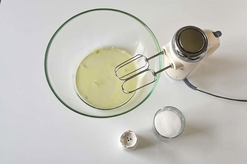 Białka ubijamy z odrobiną soli na sztywną pianę. Stopniowo wsypujemy cukier, cały czas ubijając.