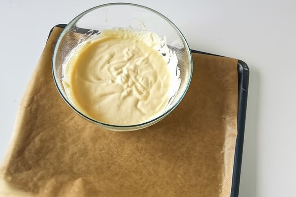 Rozgrzewamy piekarnik do 100 stopni. Papierem do pieczenia wykładamy blaszkę. Masę przelewamy. Ciasto wkładamy do piekarnika. Temperaturę zwiększamy do 170 stopni. Pieczemy około 15 minut.