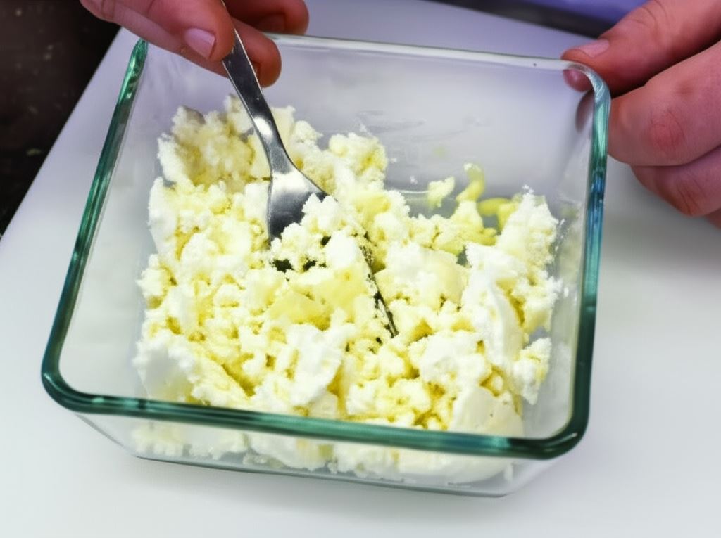 Posiekaj czosnek. Biały ser rozgnieć przy pomocy widelca i dodaj czosnek. Dopraw masę solą i pieprzem (jeśli uważasz to za potrzebne), wszystko wymieszaj.