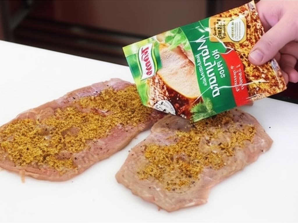Kawałki mięsa delikatnie roztłucz i oprósz marynatą do mięs Knorr.