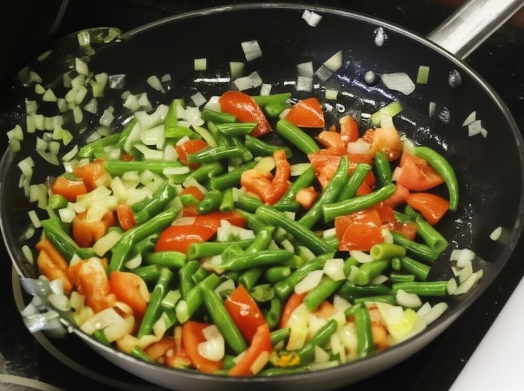 Cebulę posiekaj, a pomidory pokrój w kosteczkę. Na podgrzanej oliwie zeszklij cebulę, wsyp fasolkę szparagową, po momencie smażenia – pomidory. Przypraw je pieprzem według uznania. Roladki serwuj ze smażonymi ziemniakami i fasolką szparagową.