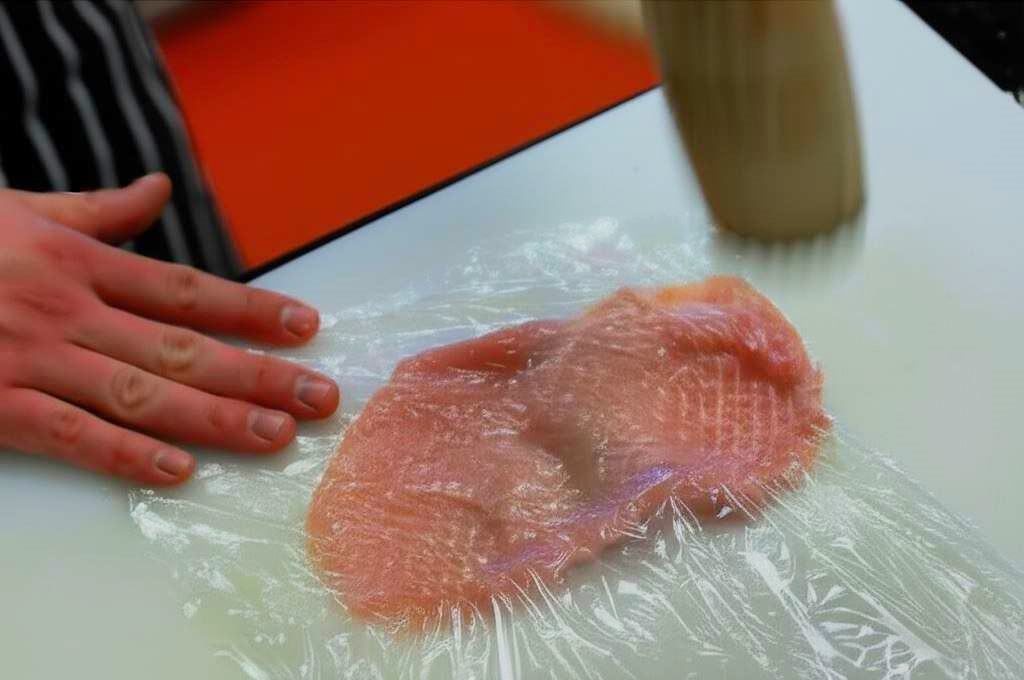 Filety z kurczaka opłucz, przetnij wzdłużnie, formując dwa cienkie płaty. Na koniec roztłucz je tłuczkiem.