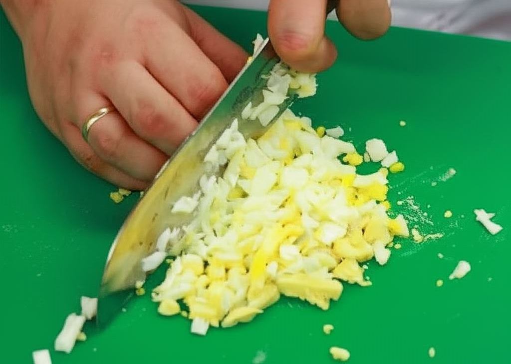 Ugotuj jajka na twardo, a gdy wystygną, pokrój je na drobne kawałki.