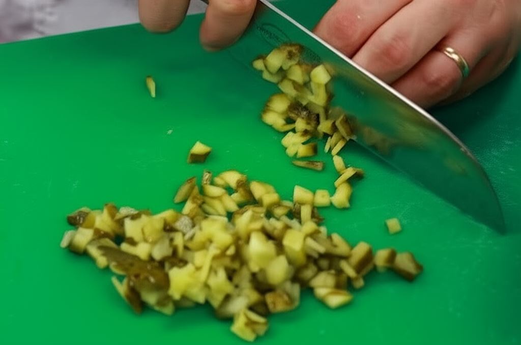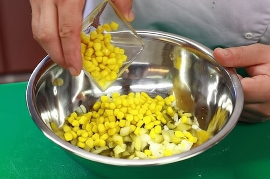 Posiekaj drobno ogórki i dodaj kukurydzę.
