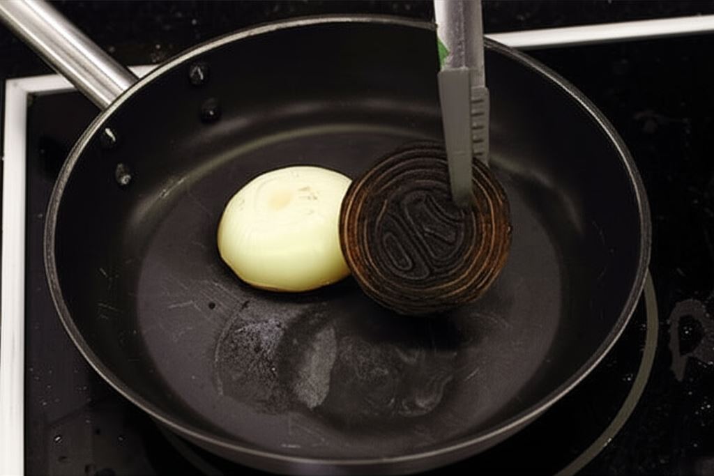 Cebulę przetnij na połowę. Osmal nad palnikiem lub przypiecz na patelni.