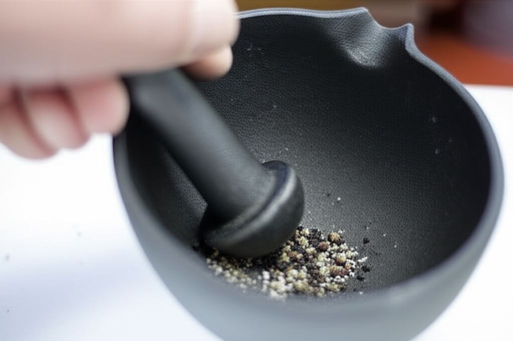 Rozkrusz cały pieprz w moździerzu. Potem jedną połowę wsyp do miski.