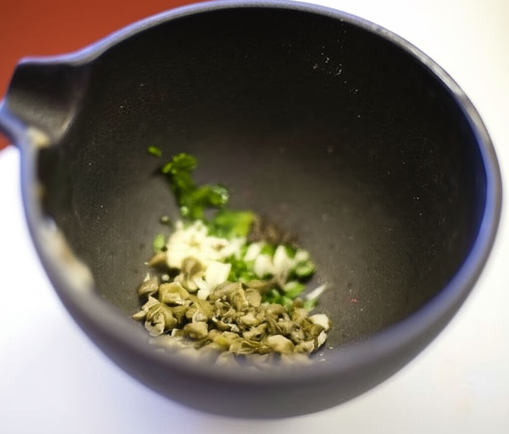 Do pieprzu w moździerzu wsyp drobniutko posiekane kapary, czosnek i natkę. Wszystko starannie wymieszaj.