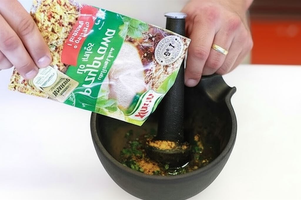 Do pieprzu w miseczce dodaj oliwę i wsyp przyprawę Knorr. Zamarynuj steki.