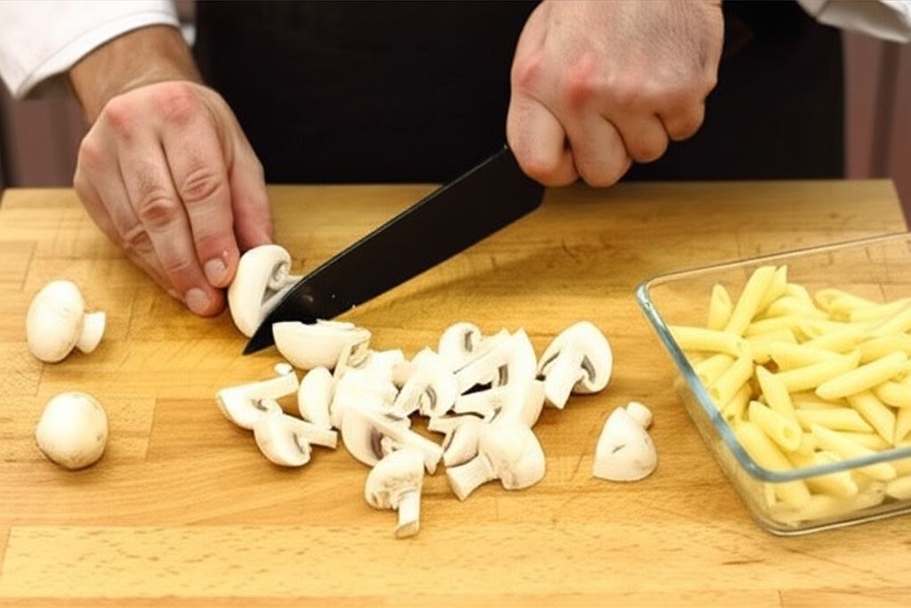 Makaron ugotuj al dente w osolonej wodzie i odcedź. Pieczarki pokrój na cztery części.