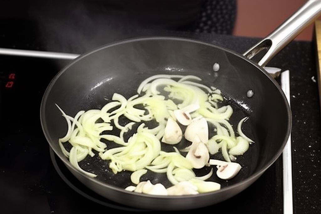 Czosnek posiekaj i podsmaż na gorącej oliwie, potem wsyp pokrojoną w piórka cebulę i smaż moment razem. Dodaj pieczarki.