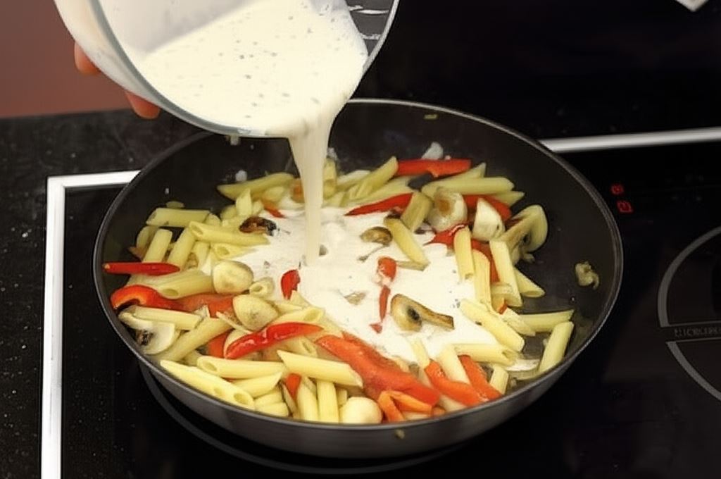 Rurki w kolorowym sosie z pieczarkami to prawdziwa uczta dla zmysłów! Delikatny makaron al dente otulony kremowym sosem, wzbogacony aromatycznymi pieczarkami i chrupiącą papryką tworzy harmonijną kompozycję smaków i kolorów na talerzu.