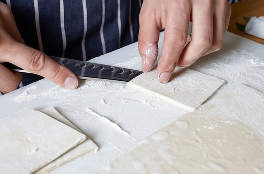 Rozbij jedno jajko. Owiń kwadraty ciasta na foremce do rurek i połącz używając niewielkiej ilości jajka.