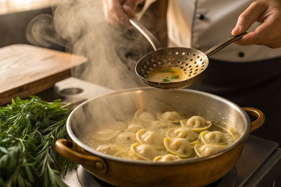 Sekret idealnie ugotowanych pielmieni tkwi w temperaturze wody. Pielmieni należy wrzucać wyłącznie do wrzącej wody – temperatura 100°C gwarantuje, że ciasto natychmiast się zetnie i zachowa swój kształt.