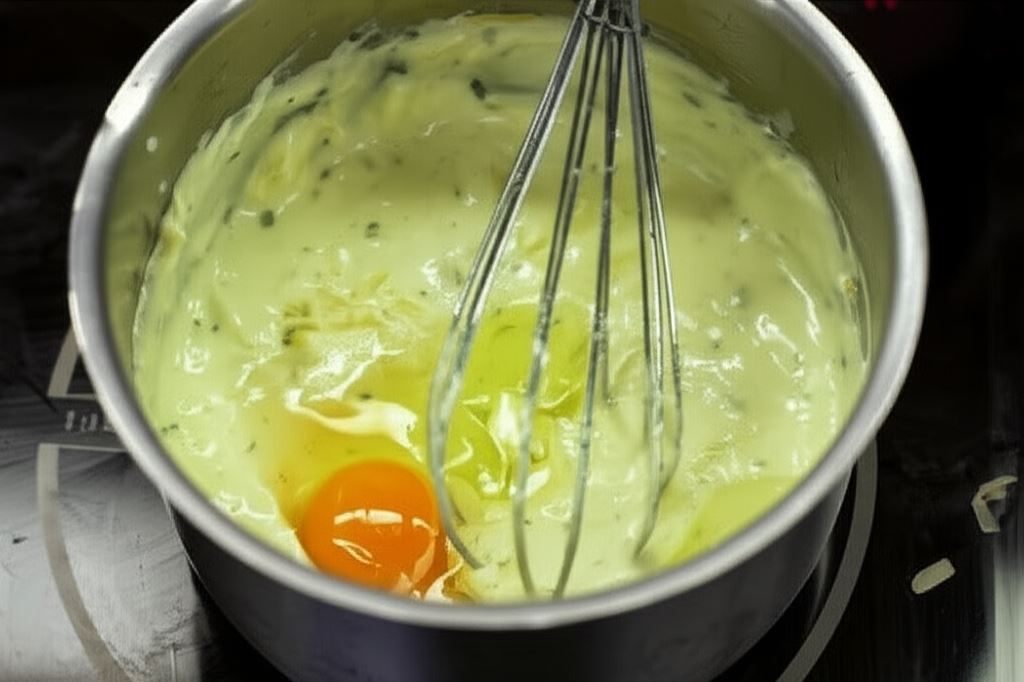 Schłodzony sos połącz z parmezanem i rozbitym jajkiem.