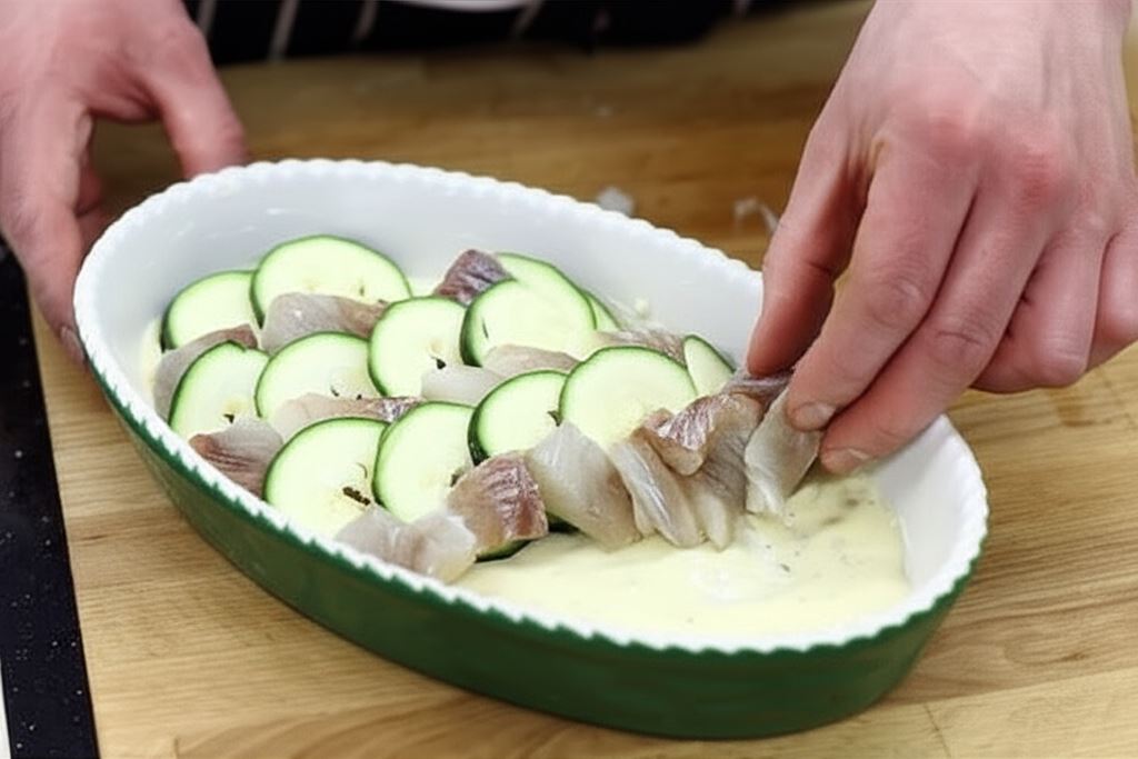 Teraz umieszczaj naprzemiennie plastry cukinii i kawałki ryby.
