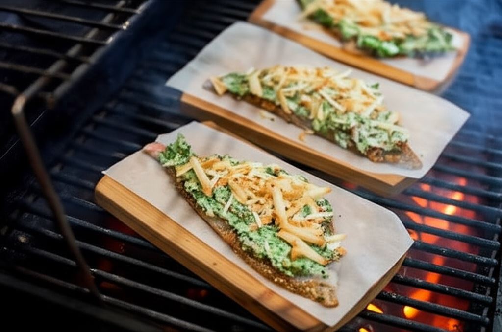 Odkryj wyjątkowy smak grillowanej dorady ze szpinakiem, która zachwyci Cię swoim aromatem i soczystością. Ta wykwintna kompozycja łączy delikatne mięso ryby z pikantną nutą chilli, bogatym smakiem szpinaku i wyrazistym charakterem oscypka. Przygotowana na kawałku drzewa owocowego nabiera niepowtarzalnego aromatu dymu, który podkreśla wszystkie walory tego dania.